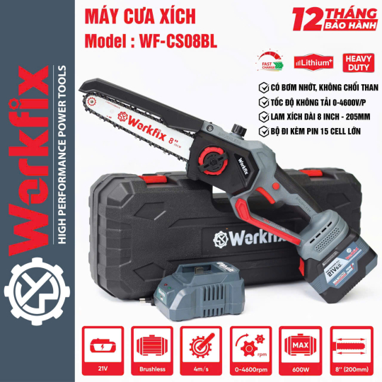 - Thân máy + Dây xích + Lam Cưa 08 inch + Hộp Đựng + 1 pin 15 cell - 6Ah + 1 sạc 2A - Điện áp pin : 21V - Tốc độ : 0-4600RPM - Động cơ không chổi than - Công Tắc Bóp - Có Bơm Nhớt Tự Động - Chống khởi động lại - Khởi động mềm - Công tắc kép an toàn - Bảo hành 6 tháng
